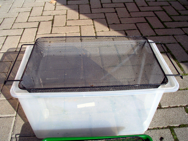 Ein Castersieb mit 3 mm Maschen, leider nur lackiert, dass sich sehr gut zum Kaulquappen aussieben eignet.