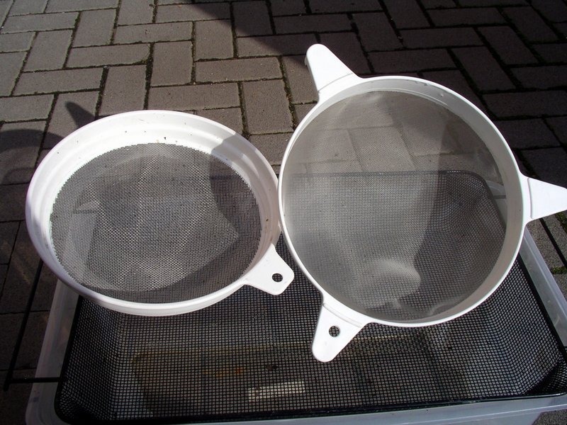 Das zweiteilige Sieb paßt auf 10 bis 15l Eimer. Mit den 0,8 mm und 0,4 mm Maschen lassen sich Wasserflöhe und Cyclops sortieren