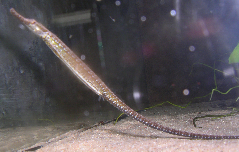 Bei zweien konnte ich die Geburt beobachten: In den Eiern sah ich Bewegungen, dann schaute ein Schwänzchen raus, der Vater schwamm vom Weibchen weg in eine ruhige Ecke und schüttelte sich, schwups stand eine Jungnadel in der Strömung.