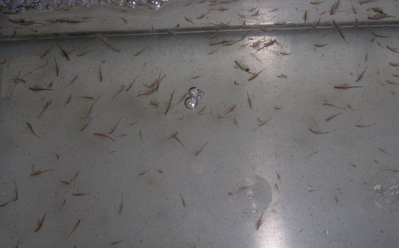 Die Zystenschalen störten kaum, da die Artemien beim Abfischen wesentlich größer sind und so gut von einander getrennt werden können. Trotzdem versuche ich möglichst wenige Zystenschalen mit in die Wannen zugeben, da sie die Kultur unnötig beschatten. Auch sollte möglichst keine Artemien in die Algenkultur gelangen.