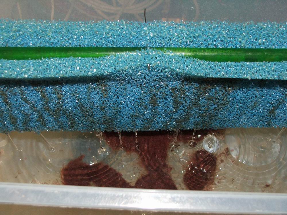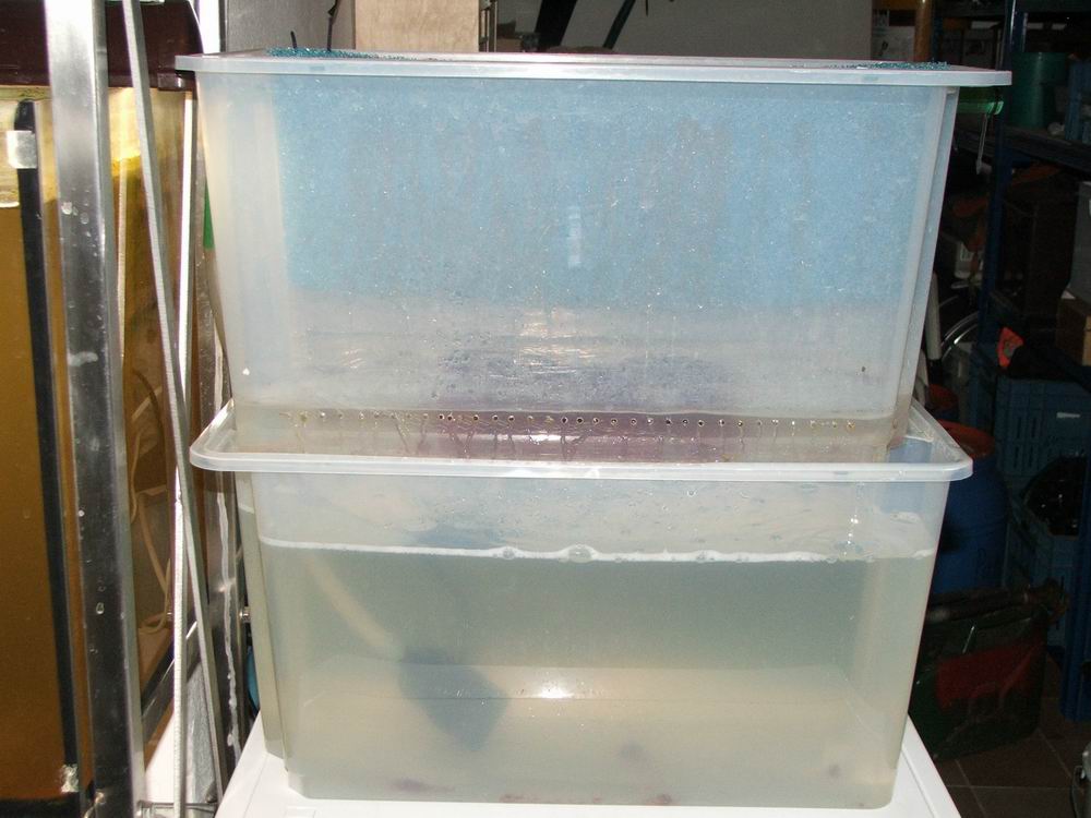 Die Pumpe fördet das Wasser zu einem Rohr mit vielen Löchern. Von dort rieselt das Wasser durch den Schwamm und tropft auf die Tubifex. Der Wasserstand bei den Tubifex sollte ca. 4 cm groß sein. Die seitlichen Abflußlöcher, 4-5mm, nicht zu klein wählen, da der Abfluß durch die Atäsionskräfte gebremst wird. Der Wasserstand in der unteren Wanne sollte bis kurz unter die obere Wanne reichen.
